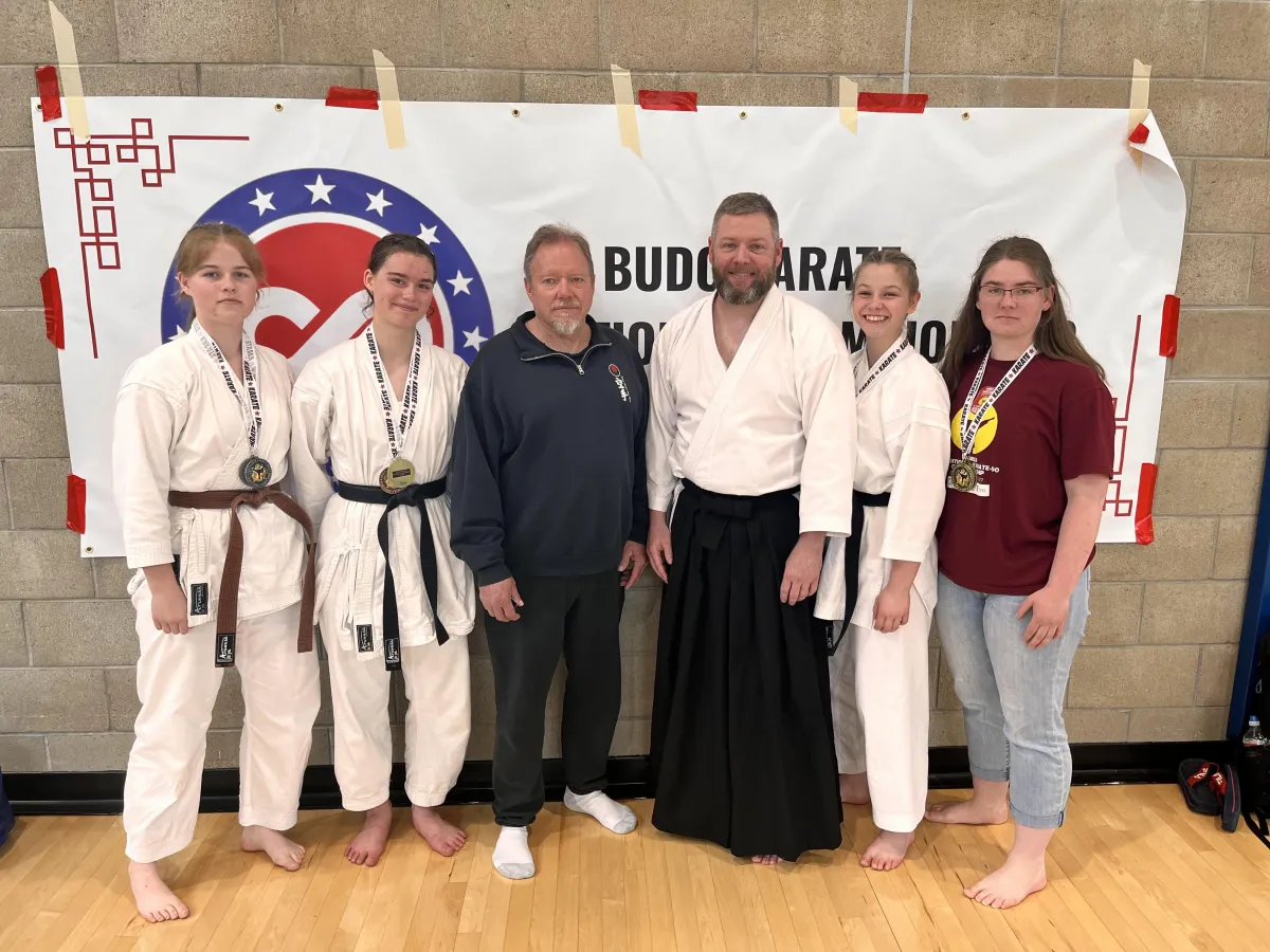 Traditional Karate Academy sent four competitors—Ava Rosendahl, Ava Moore, Isabel Shuey, and Julianna Rosendahl—to the 2025 U.S. Budo Karate Association Nationals held in San Diego, California. The team delivered an outstanding performance, bringing home a total of eight medals: five gold, two silver, and one bronze.